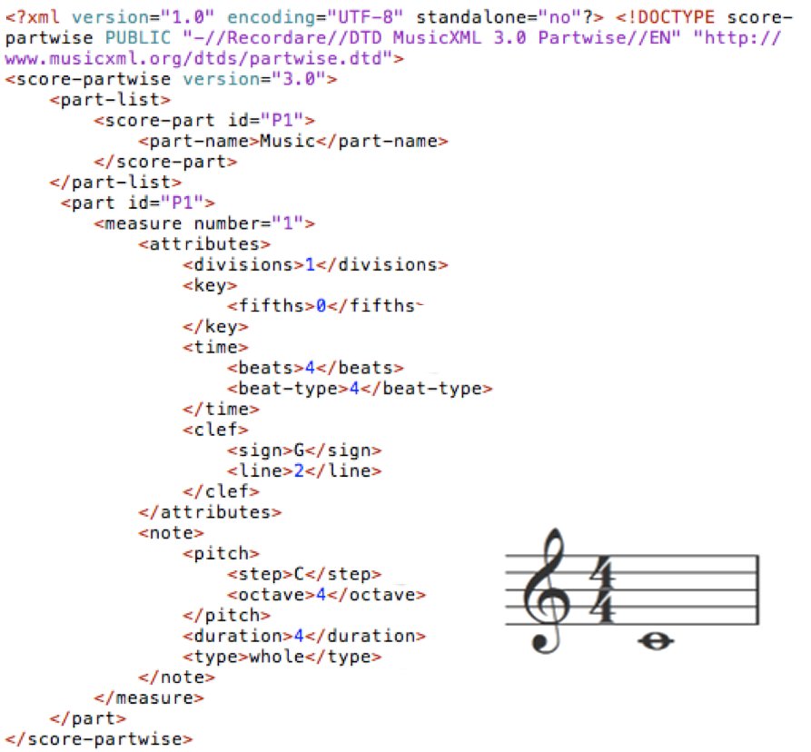 Voici, en langage "xml", l'écriture correspondant à la représentation de la note Do Ronde avec une clef de Sol et une mesure à 4/4